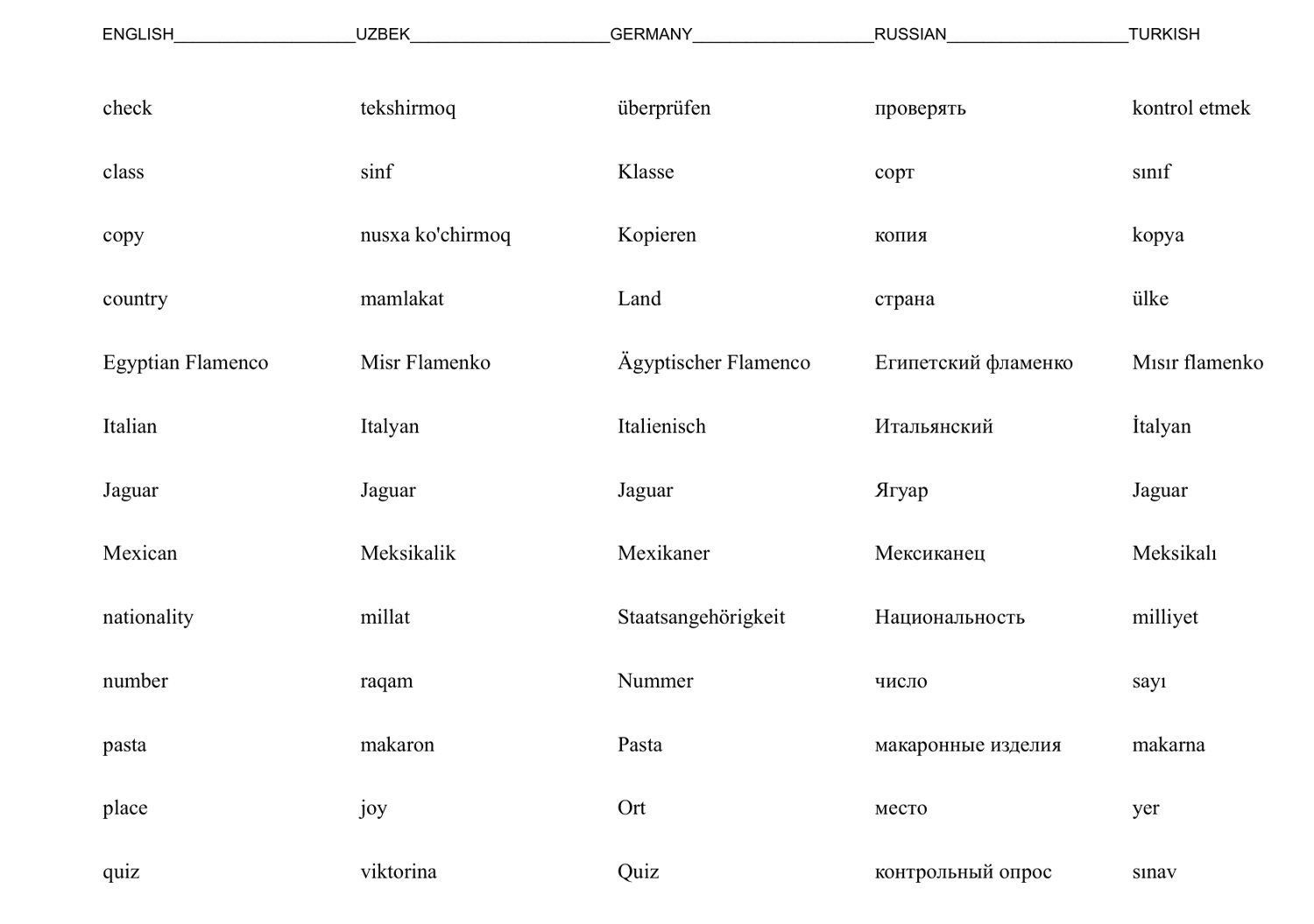Ingliz, O‘zbek, Nemis, Rus va Turk Tillariga Tarjima Qilingan So‘zlar